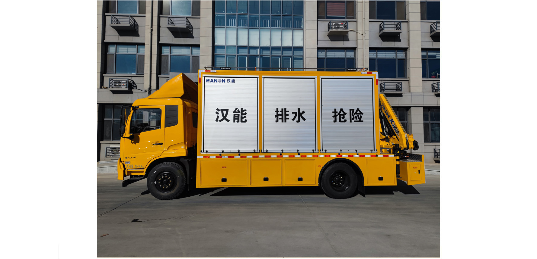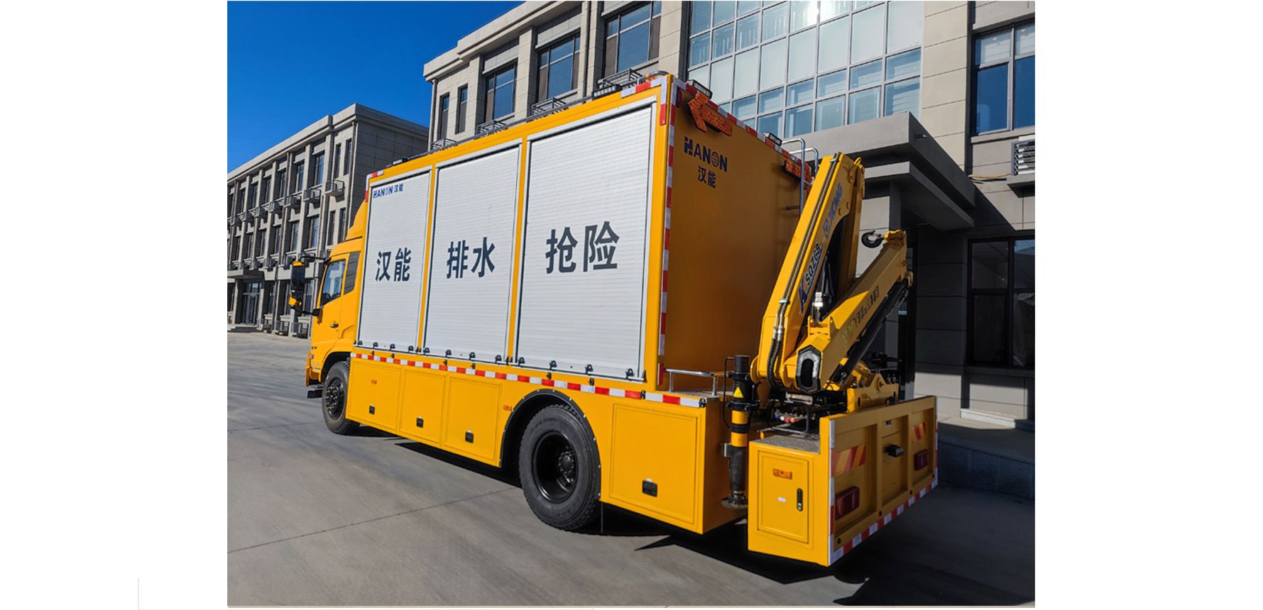 3000型排水抢险车,是我公司自主研发的用以搭载救险人员、抢险设备和抢修工具为一体的车型。该车车厢为适应各种行业的特殊要求,进行了特殊设计。车厢内部可配备发电机组、逆变电源、液压取力系统、液压工具、便携式潜水泵、渣浆泵、变频控制柜等各种抢险设备,广泛适用于市政工程、道路维护、供水、排水等领域的应急救险。车辆尾部配置折臂式起重机(额定起重质量3.2吨)。