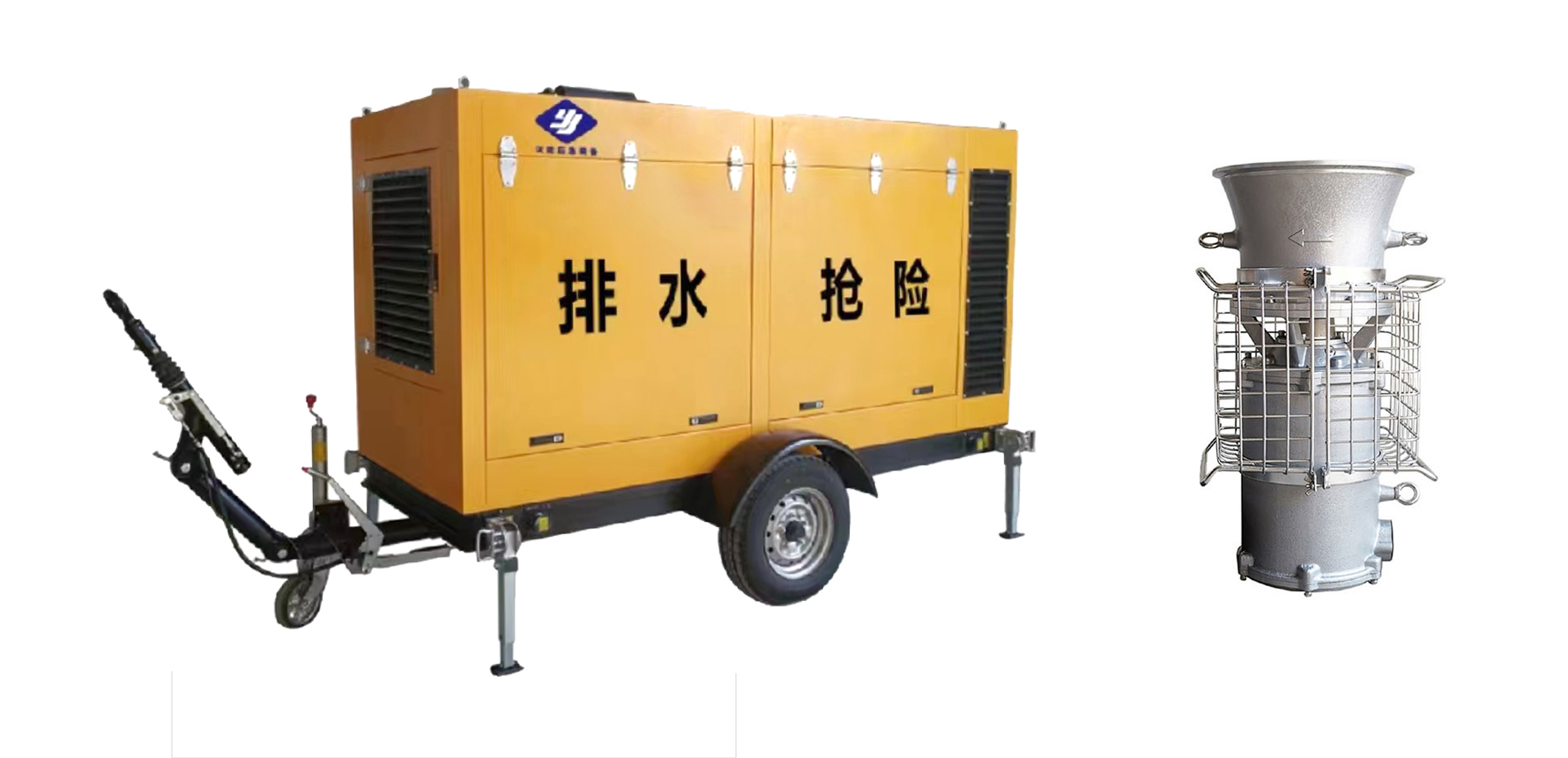 拖车式轻潜泵是以柴油机为动力,驱动两台轻潜泵,且加装防雨罩的高效大流量排水设备。轻潜泵是针对城市道路内涝积水而专门设计的高性能排水泵,该泵壳材质采用铝合金,电机采用永磁同步电机,采用潜水专用电缆,该泵最大特点为体积小、重量轻,广泛应用于防汛抢险、城市排涝、低洼地排除积水等领域。
